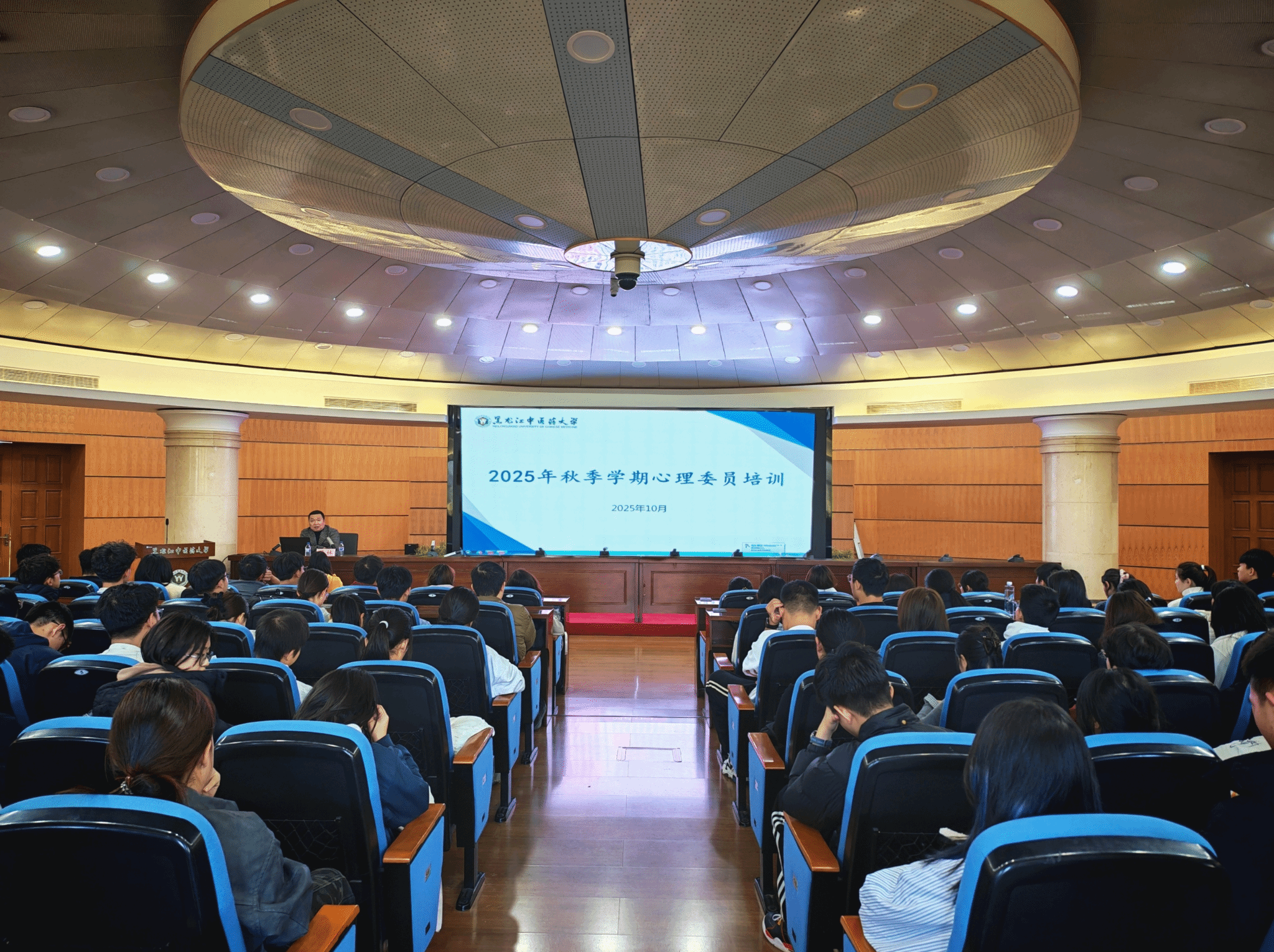 10月22日下午,学生工作部在求真讲堂举办2025年秋季学期班级心理委员培训,邀请哈尔滨师范大学马林教授以“大学生心理问题识别与心理委员的自我成长”为题作专题培训。